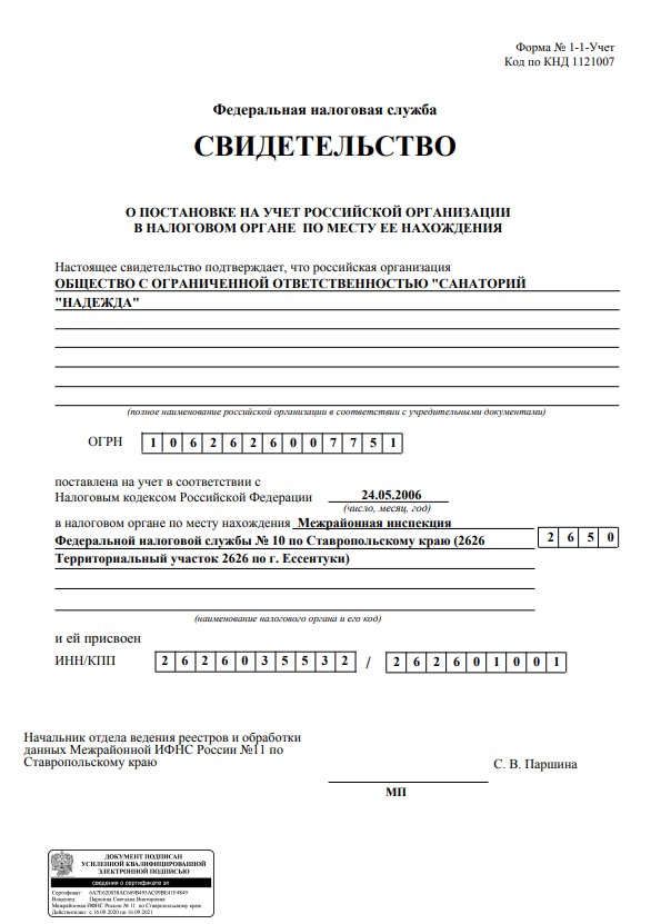 Свидетельство о постановке на учет организации в налоговом органе по месту ее нахождения