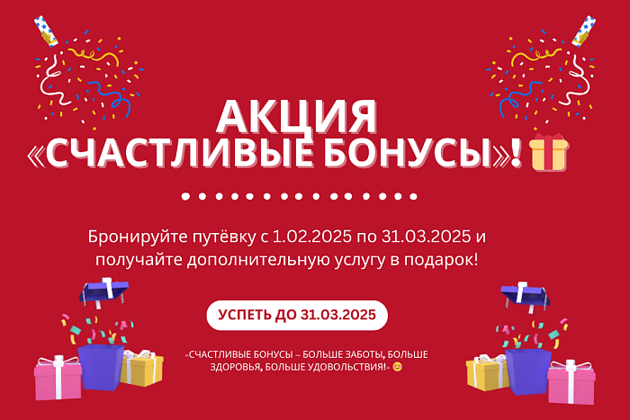 С 1 февраля по 31 марта 2025 года гости санатория, приобретающие путёвки по программам «Общетерапевтическая» или «Специальная», смогут воспользоваться приятным бонусом!